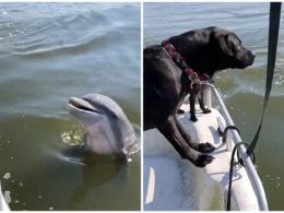 海裡的狗 VS 陸上的狗! 海豚友善「躍出水面」主動打招呼:泥好啊~