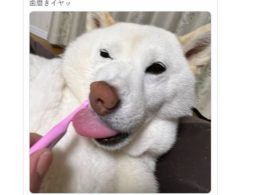 白柴「太不愛刷牙」猙獰臉想抗拒 表情太兇主人問:你誰?