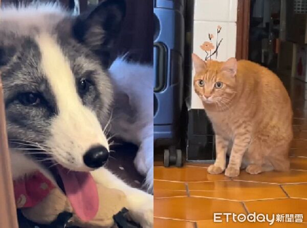 10個月的白金色赤狐「貝果」首次跟飼主回阿嬤家。結果叔叔養的橘貓「小橘子」第一次看見狐狸,瞬間變成「傻眼貓咪」,眼睛瞪大進入警戒模式,離外出籠超遠緊盯著貝果不放,滿臉懷疑彷彿在思考牠到底是哪種生物。